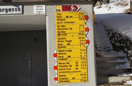 Von Wiesen-Kirche links, die Hauptstrasse überqueren und durch die Aussergasse am Hotel Muchetta vorbei gerade aus bis Hausnummer 23 laufen, dann scharf rechts Richtung Wiesneralp. Dies ist der alte Schlittelweg, der jedoch nicht mehr offiziell aufgeführt ist, Benützung auf eigenes Risiko.
